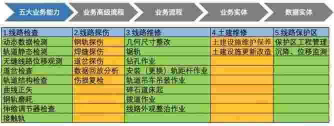 在轨道运维业务中,,我们形成了完整的从业务能力(业务域)-业务流程-业务实体-数据模型的分析梳理过程。。。。轨道运维业务能力如下图所示::::